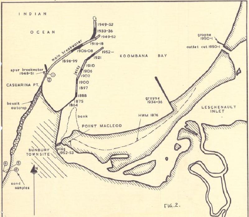 By 1900 the initial breakwater was in place. The Bunbury townsite was jammed hard against the harbour (perhaps the top half of the hatched area shown the the 1955 map). It had access to the sheltered beach either side of the jetty. Directly to the west of the town was the open ocean, edged by a basalt outcrop (which in conjunction with the southern sand flow had formed the townsite). South of this basalt outcrop was a splendid sandy beach that ran as far as Busselton, 40 km to the south. This beach was backed by a band of bare sandhills a kilometre or so wide. This matched the sandhills of the peninsula that formed Leschenault Inlet. There was no easy access from the town to this ocean beach, nor it seems, much enthusiasm for such access.