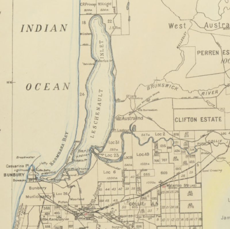 The general situation is indicated in the following map, from 1913. The rather optimistically named Koombana Bay gives some protection at its most southern point, protection from the most common weather that comes in from the south-west and the west. Weather from the north is less common, but not unknown. At the southern extremity of the bay is the rather narrow and shallow entrance to the extensive Leschenault inlet, which is completely protected. The entrance was kept open by the outflow of the substantial Collie River from the east, and the smaller Preston River from the south-east.