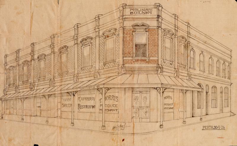 We have a pencil sketch of the building, from July 1926. It is proudly labelled the Molinari Building, being now owned by Bernardo Molinari. The ground floor advertises a Wine Salon, and the Caprera Restaurant and, somewhat incongruously, a produce merchant. The first story clearly provides residential accommodation.