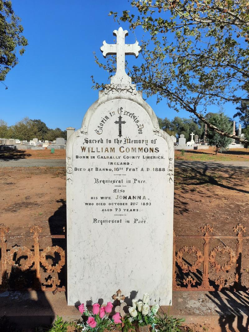 Johanna was born in 1821 in Nenagh, a market town in County Tipperary, Ireland. She married William Commons in 1842, in his home town. They emigrated in 1854 with their first three children. Their fourth child, Martin, was born at sea on the journey. Their fifth child is listed in several family trees as being born in Jericho, Tasmania, but I cannot confirm this. Their sixth child was born in Victoria.