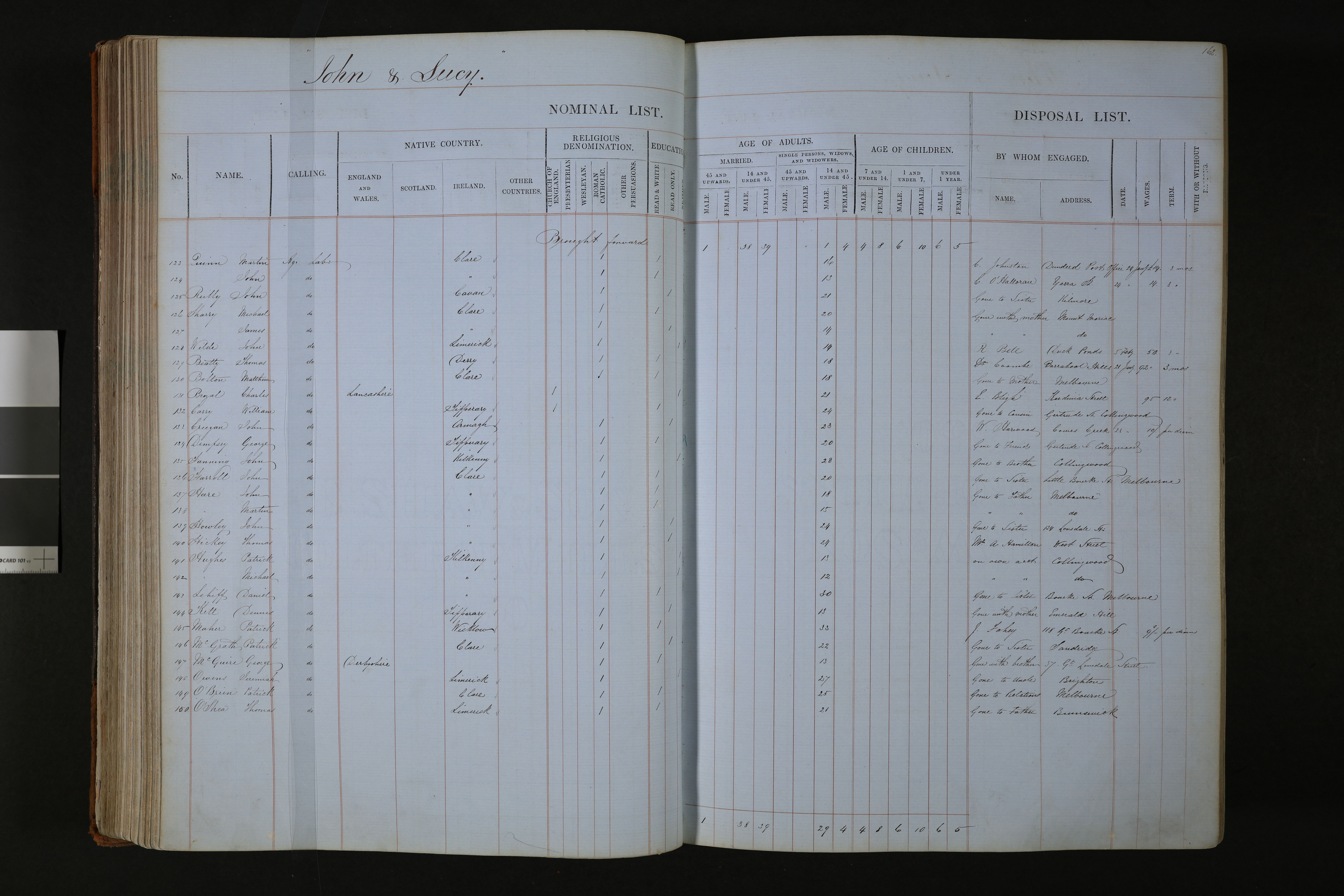 Of the 45 immigrants on the page, 43 come from Ireland (the other two come from Scotland). All the immigrants from Ireland identify as Roman Catholic. John and Margaret can read and write (about half the adults on the page can read only). John is an agricultural labourer. He was engaged to work by a Mr Bennett of Gippsland, on 8 June, pay £120 for 12 months with rations included.