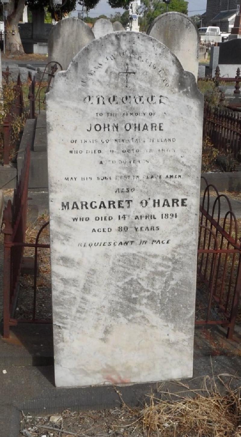 He died in 1863 after less than a decade in the colony. His death certificate lists him as “John OHaire”, aged 58. He and Margaret have an impressive gravestone.